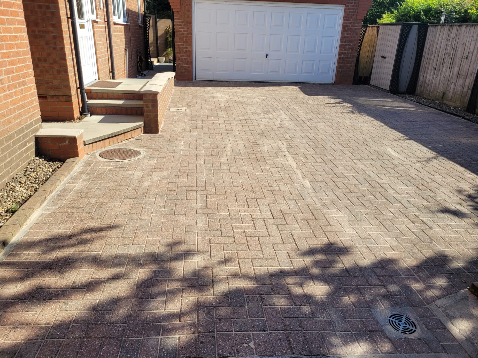 A block-paving driveway heavily infested with moss and algae. We performed a deep pressure wash, applied a fungicidal wash, and finished with kiln-dried re-sanding.