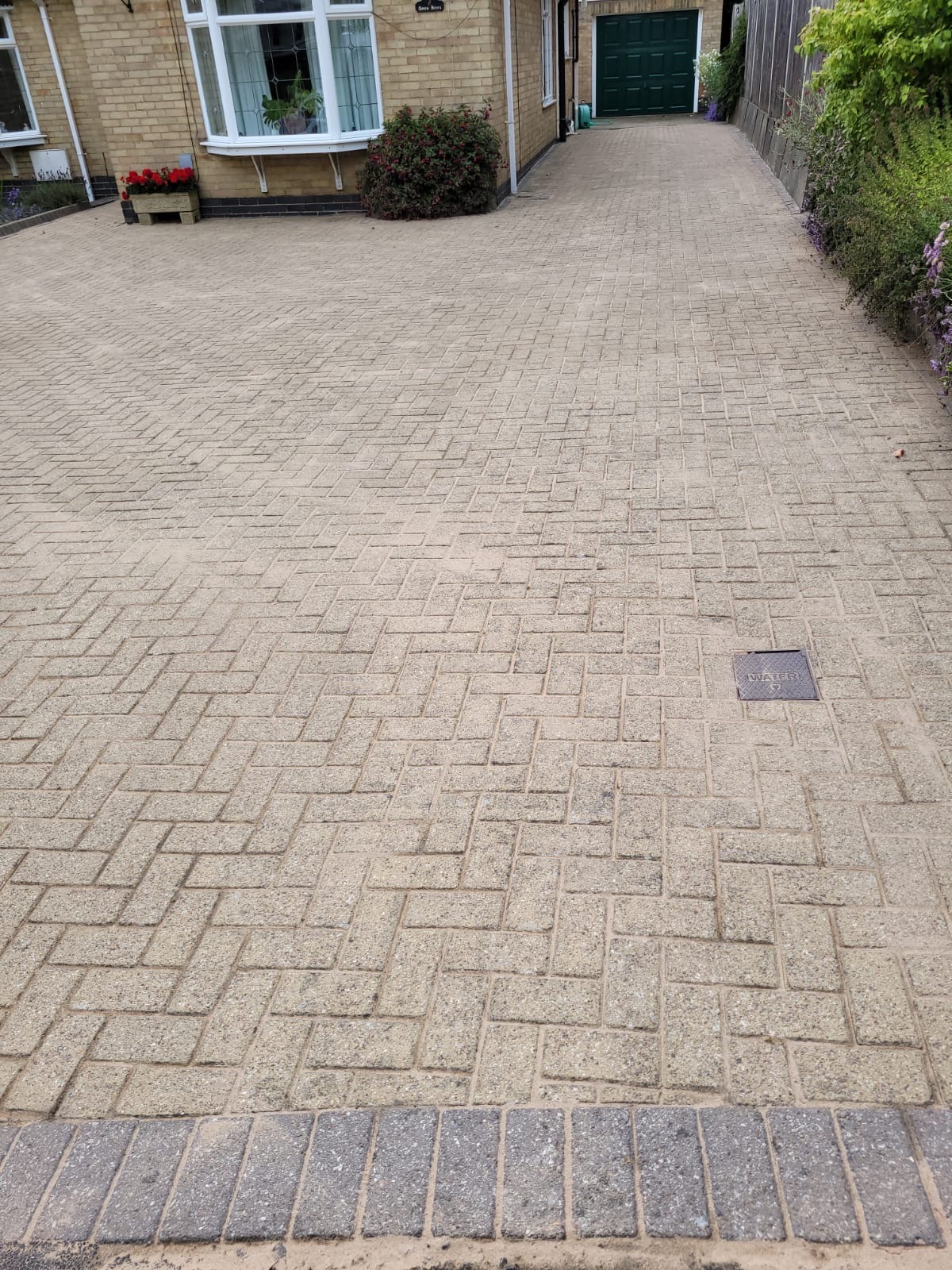 A block-paving driveway heavily infested with moss and algae. We performed a deep pressure wash, applied a fungicidal wash, and finished with kiln-dried re-sanding.
